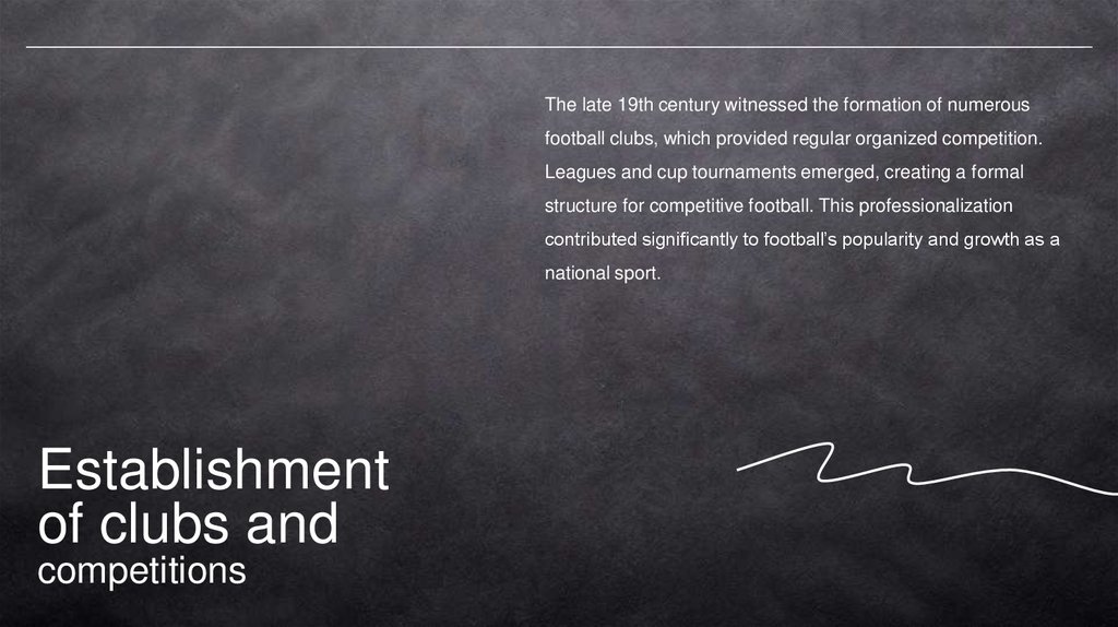 The late 19th century witnessed the formation of numerousfootball clubs, which provided regular organized competition.