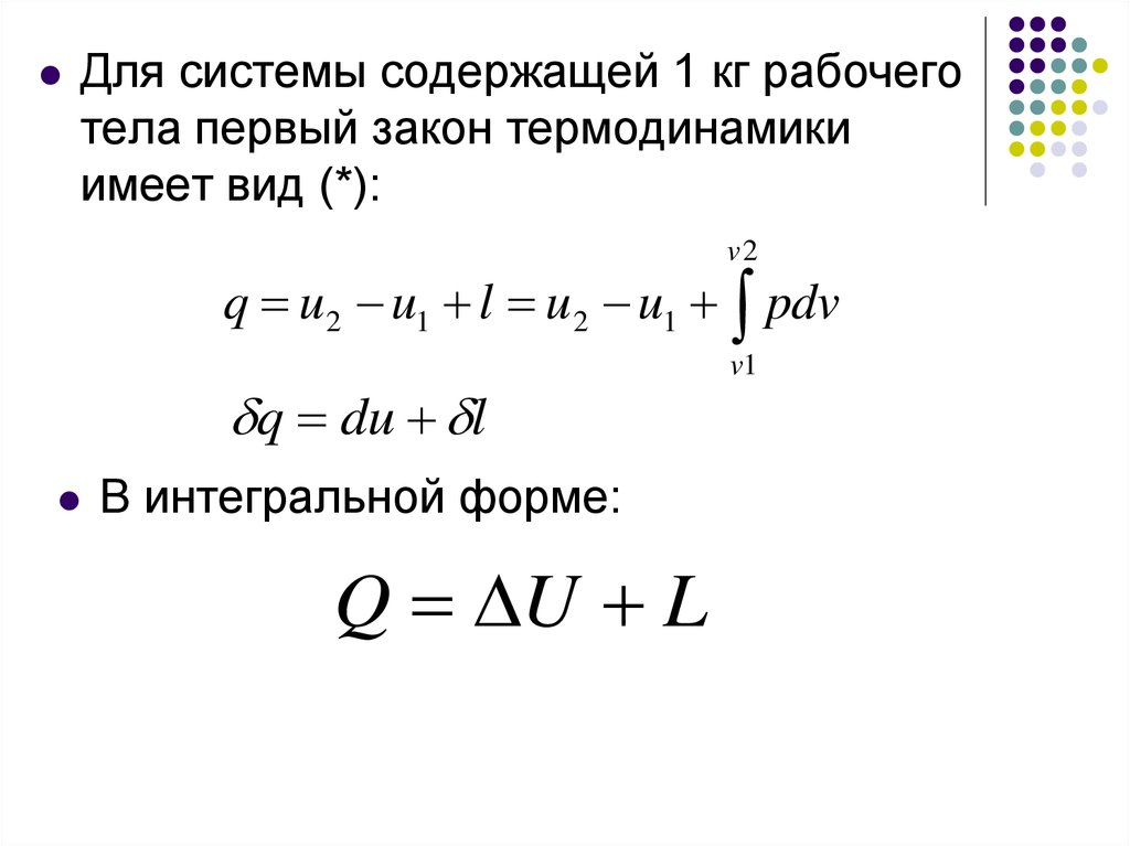Для системы содержащей 1 кг рабочеготела первый закон термодинамики: