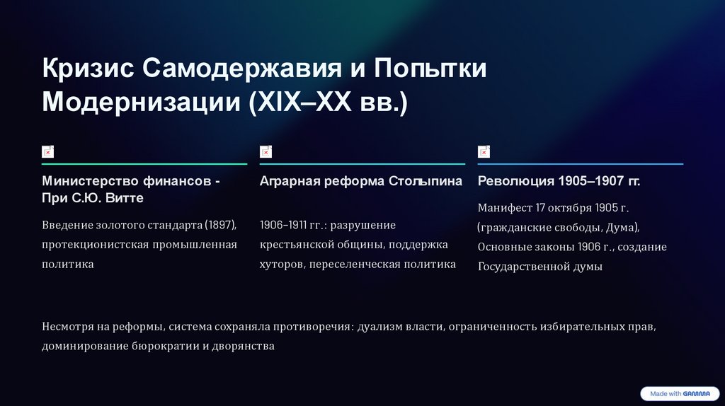 Несмотря на реформы, система сохраняла противоречия: дуализм власти, ограниченность избирательных прав,