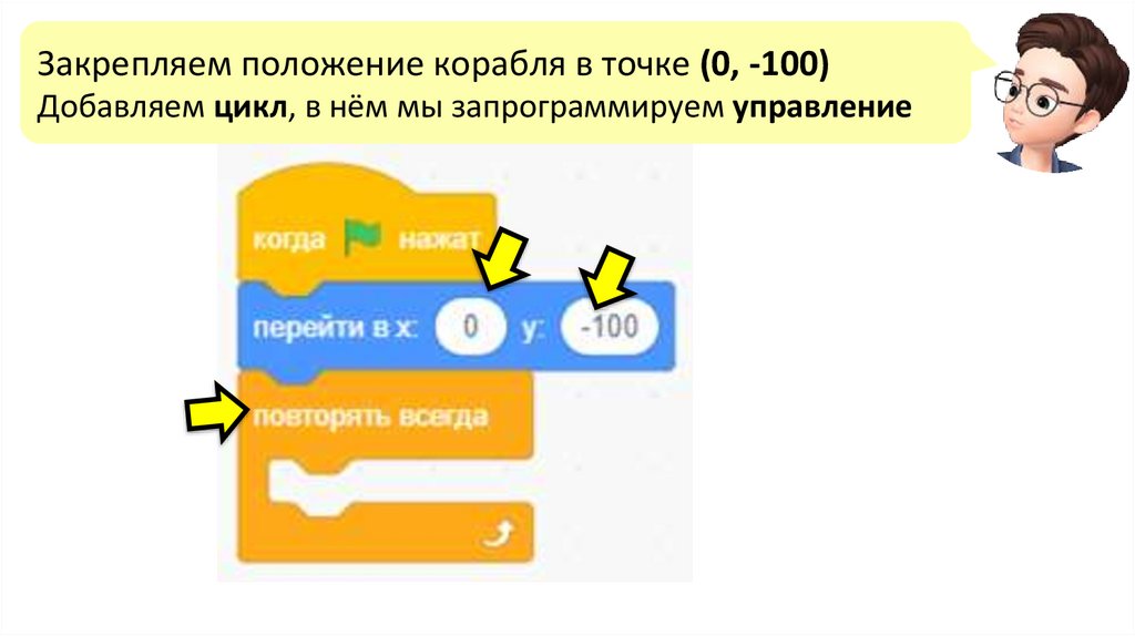 Закрепляем положение корабля в точке (0, -100)Добавляем цикл, в нём мы запрограммируем управление
