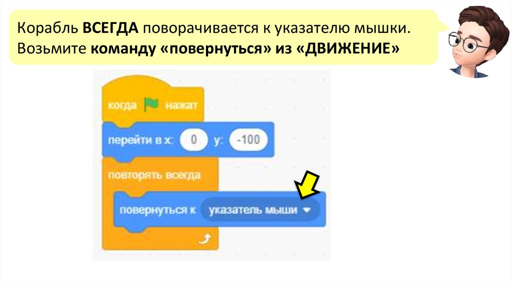 Корабль ВСЕГДА поворачивается к указателю мышки.Возьмите команду «повернуться» из «ДВИЖЕНИЕ»