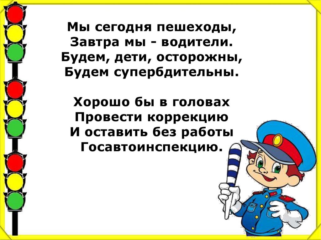 Мы сегодня пешеходы,Завтра мы - водители.