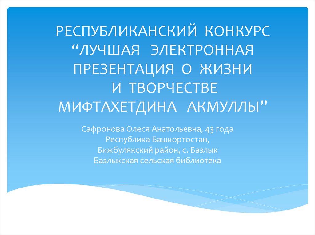 1. РЕСПУБЛИКАНСКИЙ КОНКУРС “ЛУЧШАЯ ЭЛЕКТРОННАЯ ПРЕЗЕНТАЦИЯ О ЖИЗНИ И ТВОРЧЕСТВЕ МИФТАХЕТДИНА АКМУЛЛЫ”