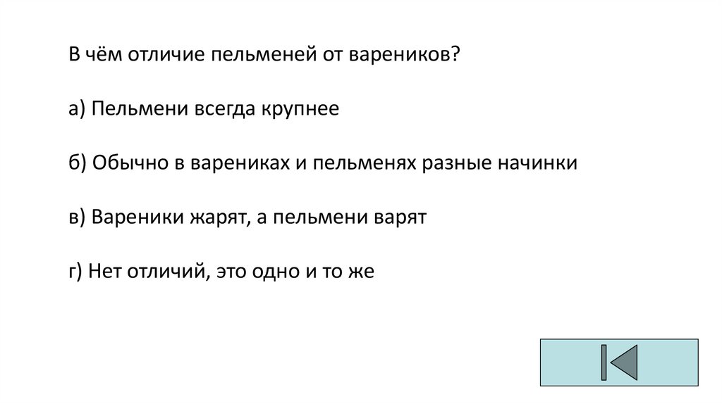 В чём отличие пельменей от вареников?а) Пельмени всегда крупнее