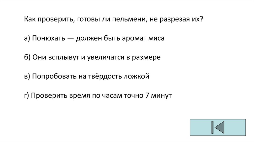 Как проверить, готовы ли пельмени, не разрезая их?а) Понюхать — должен быть аромат мяса