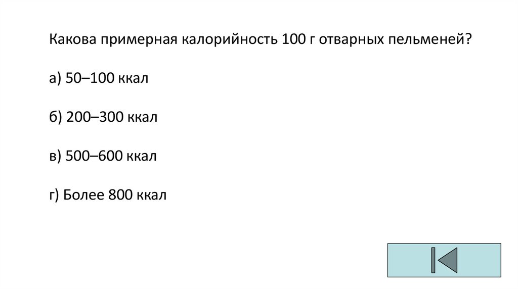 Какова примерная калорийность 100 г отварных пельменей?а) 50–100 ккал