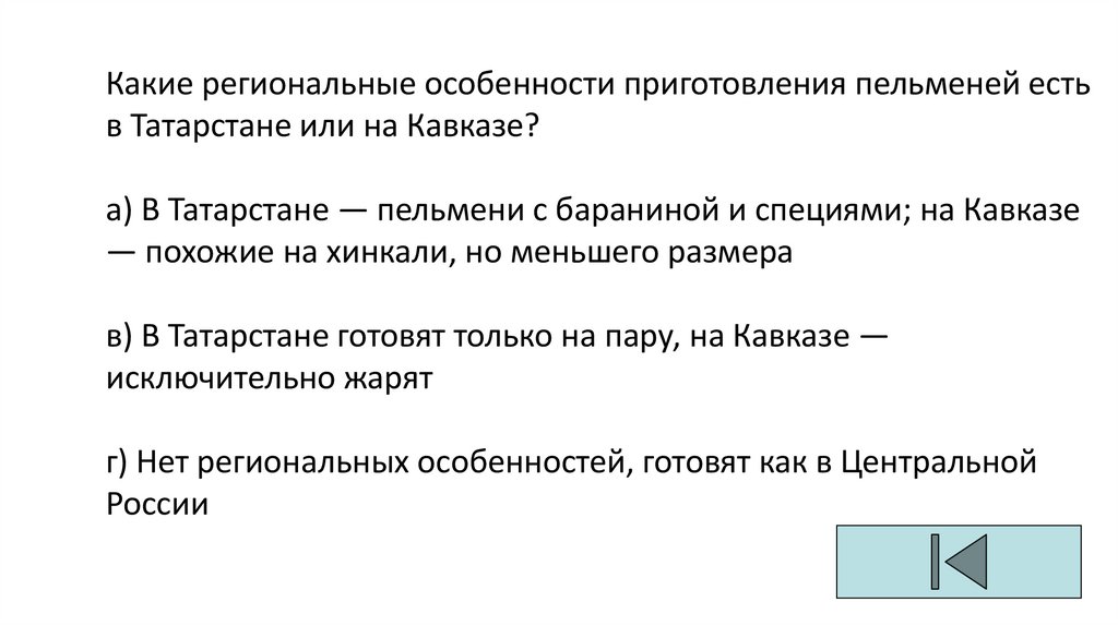 а) В Татарстане — пельмени с бараниной и специями; на Кавказе