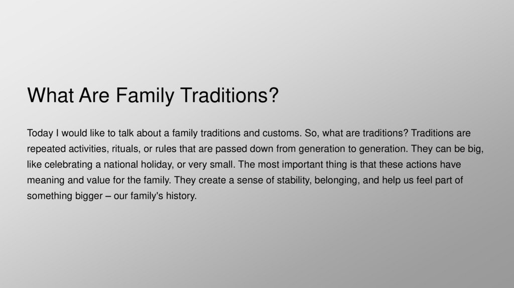 What Are Family Traditions?Today I would like to talk about a family traditions and customs. So, what are traditions? Traditions are