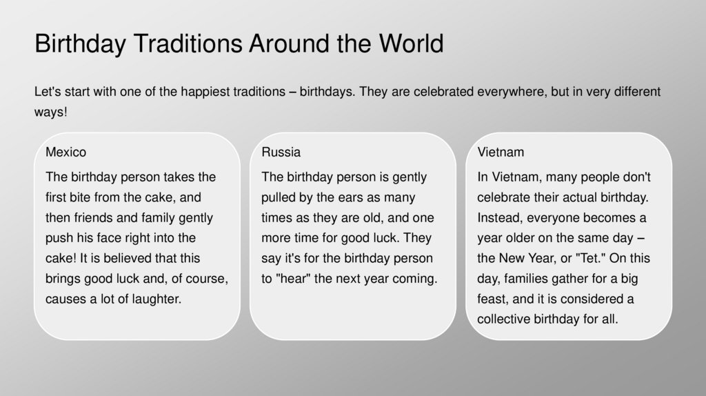 Birthday Traditions Around the WorldLet's start with one of the happiest traditions – birthdays. They are celebrated everywhere, but in very different