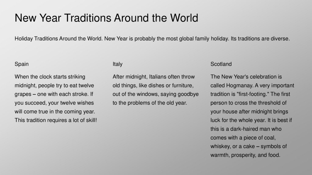 New Year Traditions Around the WorldHoliday Traditions Around the World. New Year is probably the most global family holiday. Its traditions are diverse.