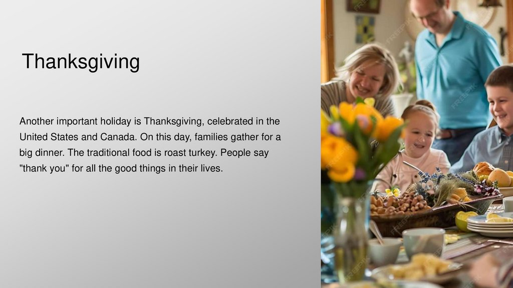 ThanksgivingAnother important holiday is Thanksgiving, celebrated in the