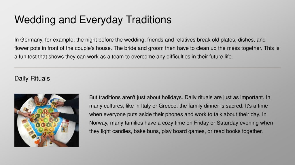 Wedding and Everyday TraditionsIn Germany, for example, the night before the wedding, friends and relatives break old plates, dishes, and