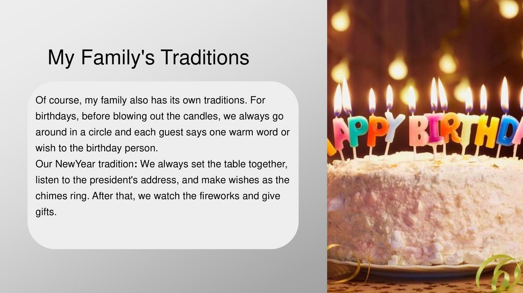 My Family's TraditionsOf course, my family also has its own traditions. For