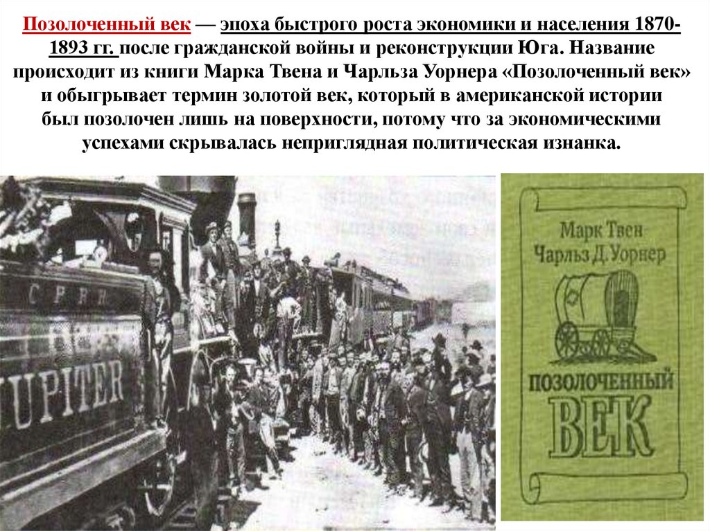 Позолоченный век — эпоха быстрого роста экономики и населения 18701893 гг. после гражданской войны и реконструкции Юга. Названиепроисходит из книги Марка Твена и Чарльза Уорнера «Позолоченный век»