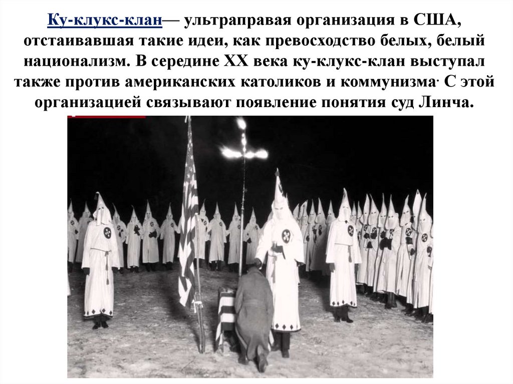 Ку-клукс-клан— ультраправая организация в США,отстаивавшая такие идеи, как превосходство белых, белый
