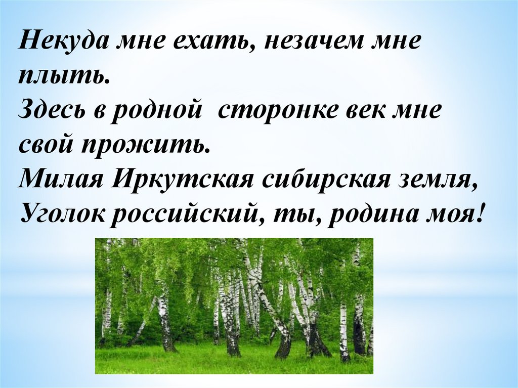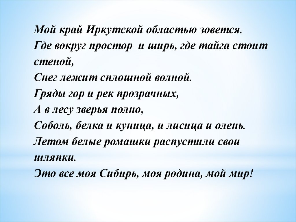 Мой край Иркутской областью зовется.Где вокруг простор и ширь, где тайга стоит