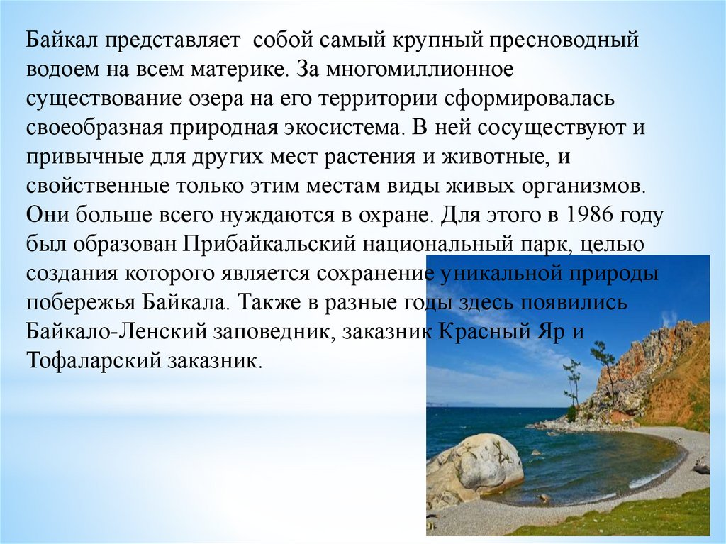 Байкал представляет собой самый крупный пресноводныйводоем на всем материке. За многомиллионное