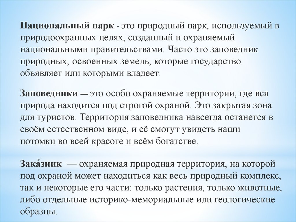 Национальный парк - это природный парк, используемый вприродоохранных целях, созданный и охраняемый