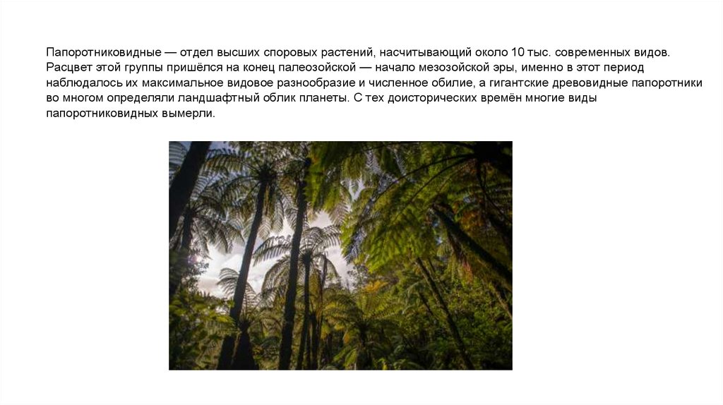 Папоротниковидные — отдел высших споровых растений, насчитывающий около 10 тыс. современных видов.Расцвет этой группы пришёлся на конец палеозойской — начало мезозойской эры, именно в этот период