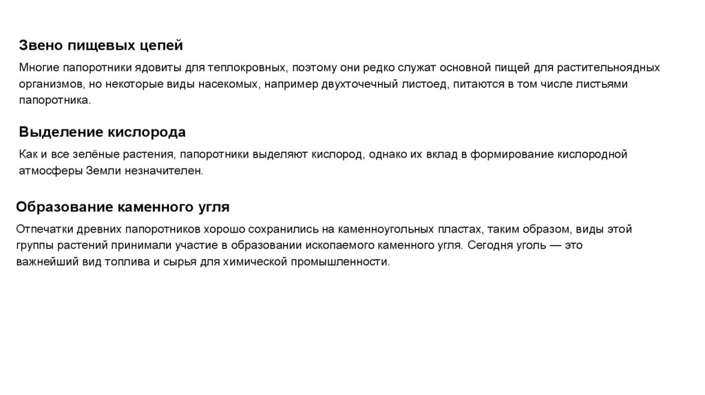 Звено пищевых цепейМногие папоротники ядовиты для теплокровных, поэтому они редко служат основной пищей для растительноядных