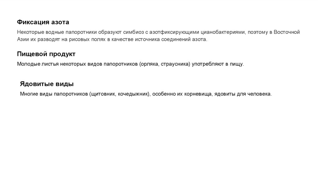 Фиксация азотаНекоторые водные папоротники образуют симбиоз с азотфиксирующими цианобактериями, поэтому в Восточной