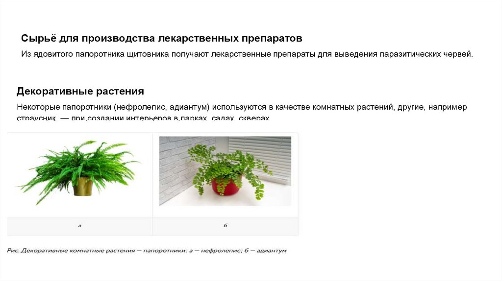 Некоторые папоротники (нефролепис, адиантум) используются в качестве комнатных растений, другие, например