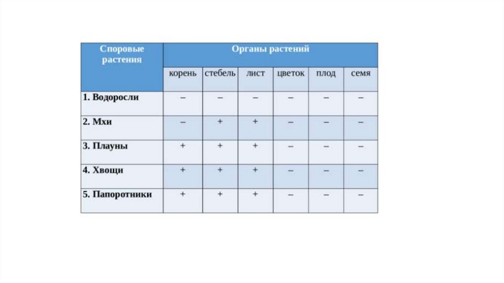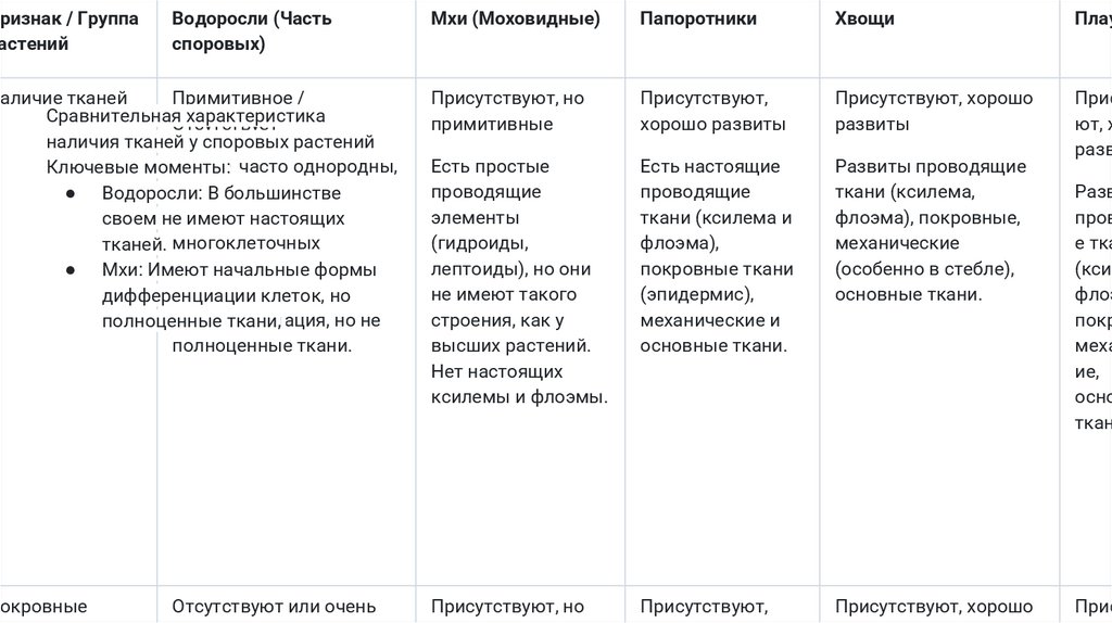 наличия тканей у споровых растений