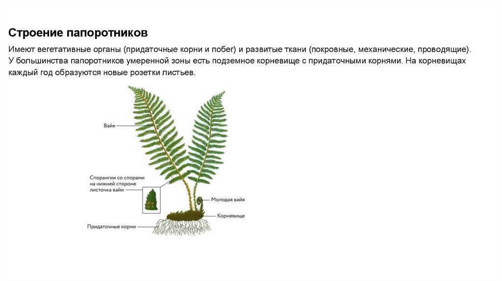 Строение папоротниковИмеют вегетативные органы (придаточные корни и побег) и развитые ткани (покровные, механические, проводящие).