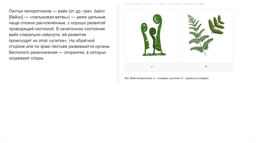 Листья папоротников — вайи (от др.-греч. baion[ба́йон] — «пальмовая ветвь») — реже цельные,