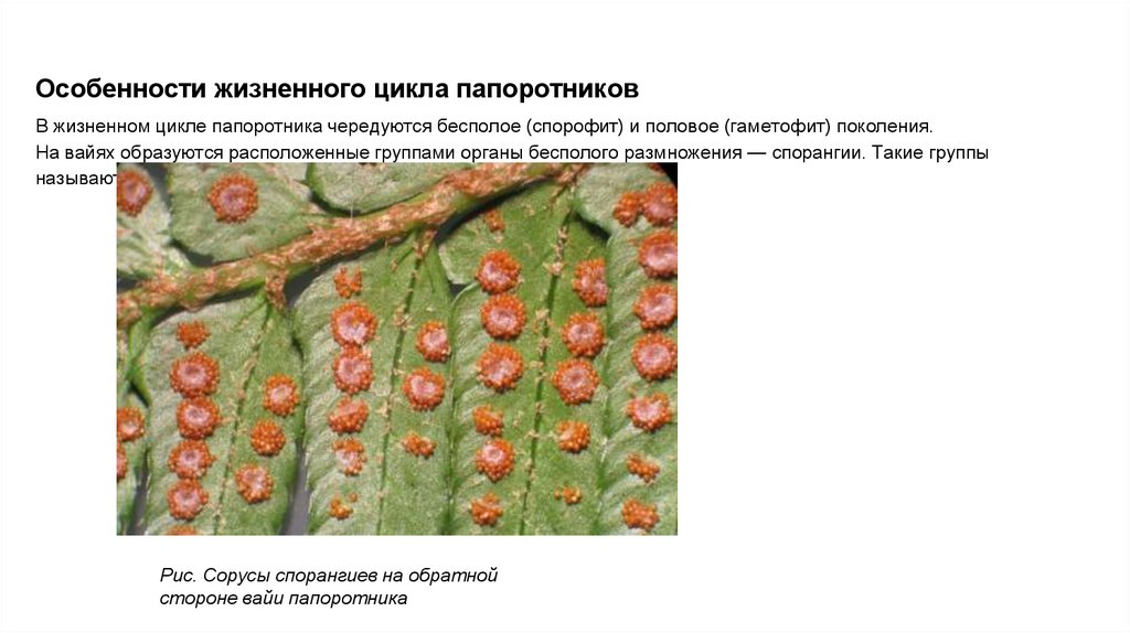 На вайях образуются расположенные группами органы бесполого размножения — спорангии. Такие группы