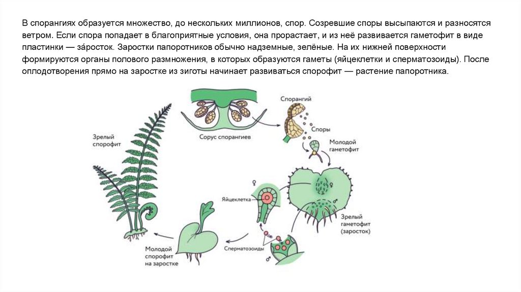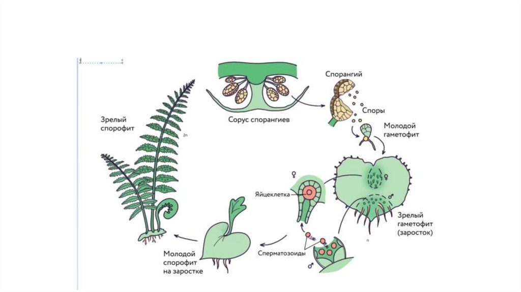 со сперматозоидами (n) и архегонии с яйцеклетками (n). Как и мхам, папоротникам для оплодотворения нужна