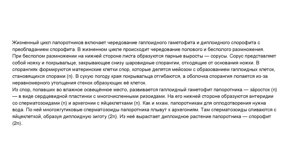 яйцеклеткой, образуя диплоидную зиготу (2n). Из неё вырастает диплоидное растение папоротника — спорофит