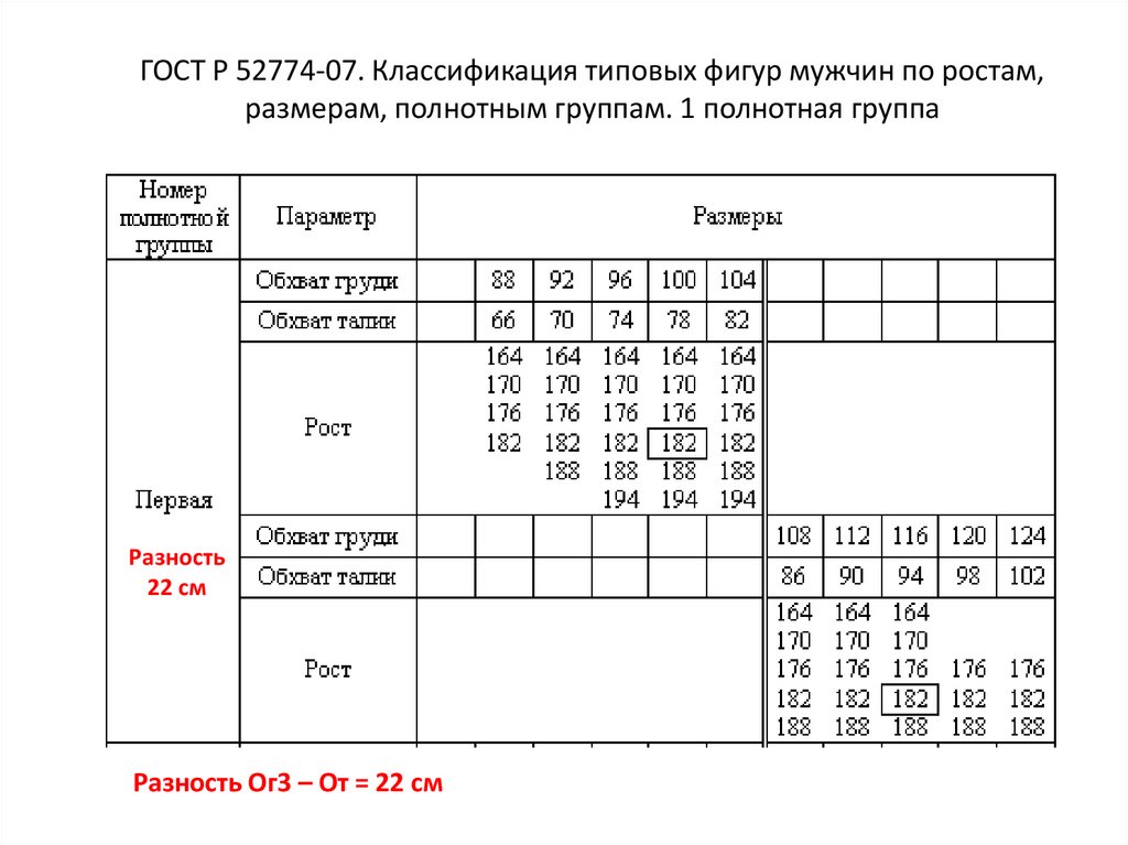 ГОСТ Р 52774-07. Классификация типовых фигур мужчин по ростам,размерам, полнотным группам. 1 полнотная группа