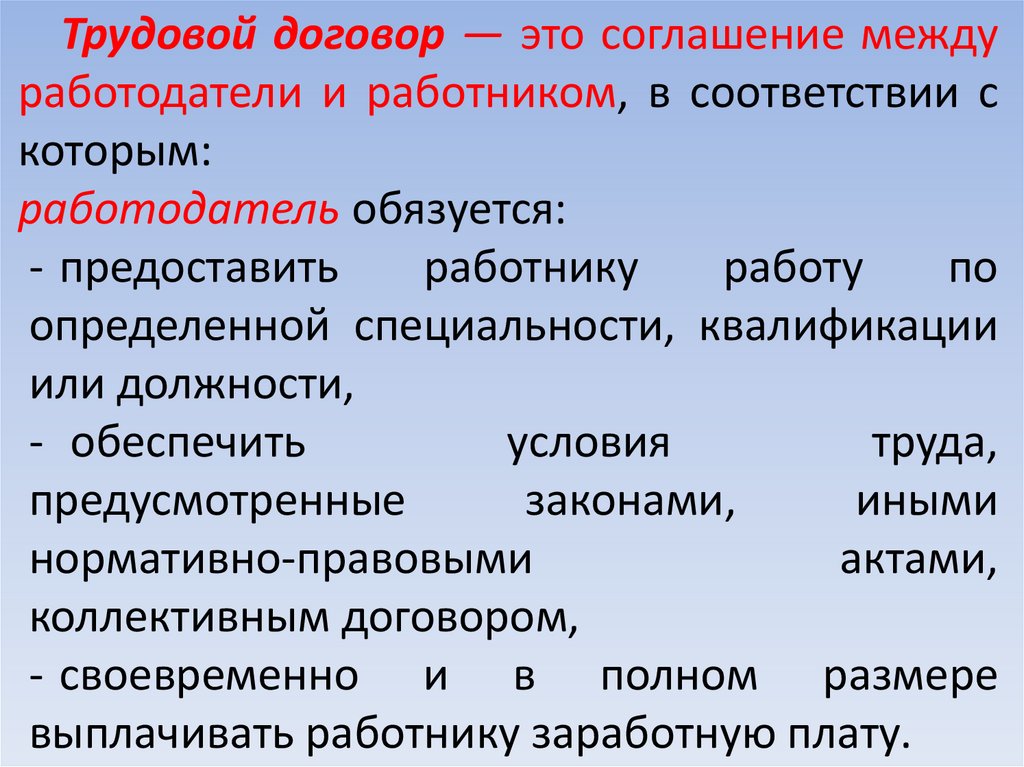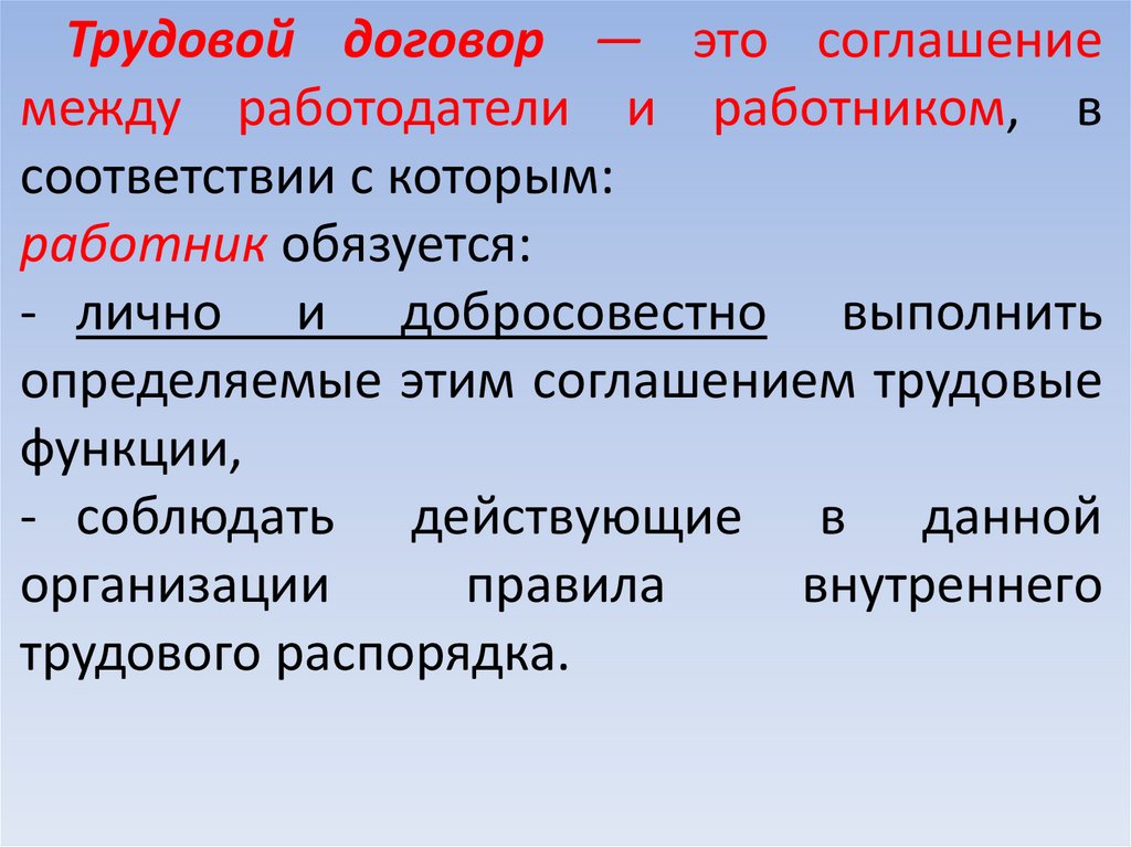 Трудовой договор — это соглашение междуработодатели и работником, в соответствии с
