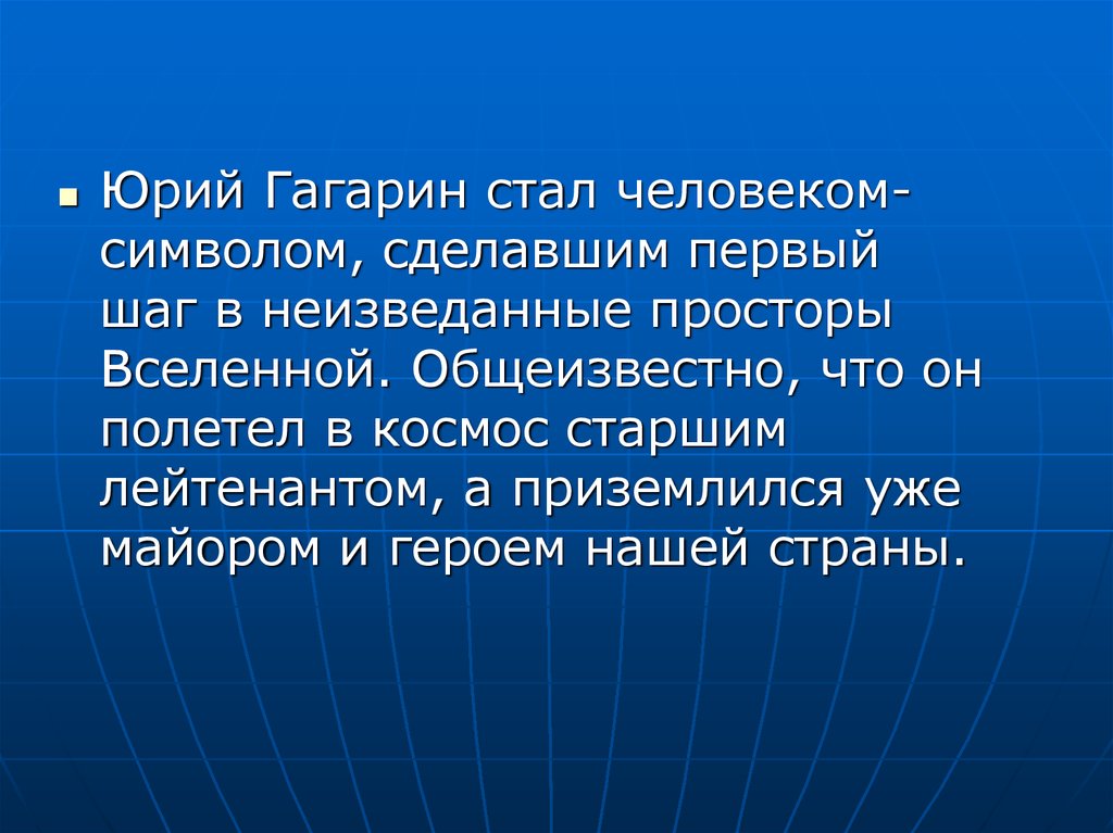 Юрий Гагарин стал человекомсимволом, сделавшим первыйшаг в неизведанные просторы