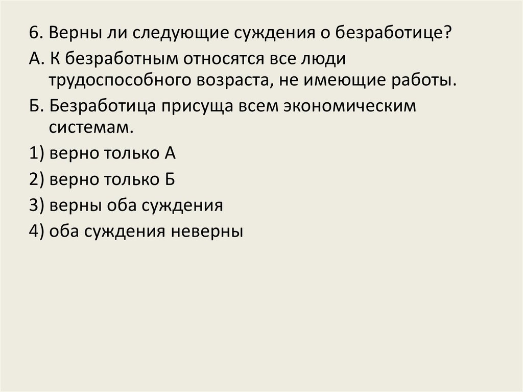 6. Верны ли следующие суждения о безработице?А. К безработным относятся все люди