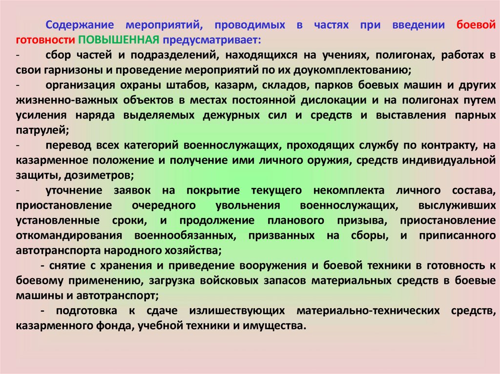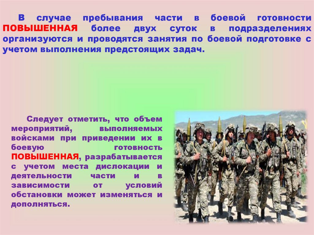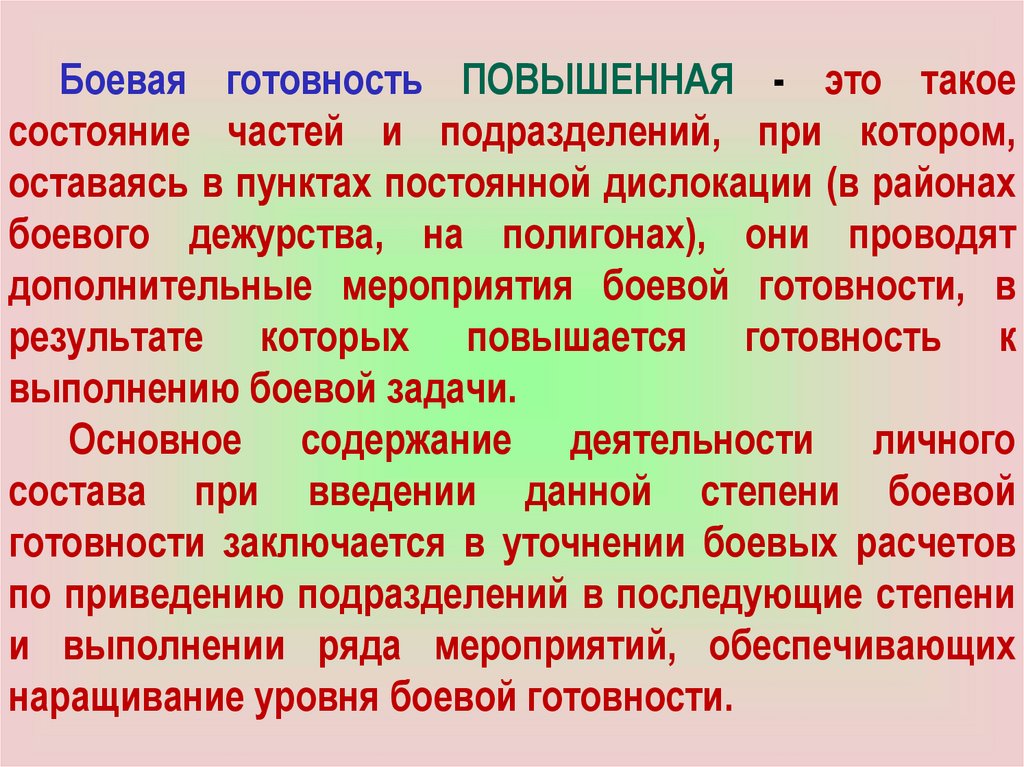 Боевая готовность ПОВЫШЕННАЯ - это такоесостояние частей и подразделений, при котором,