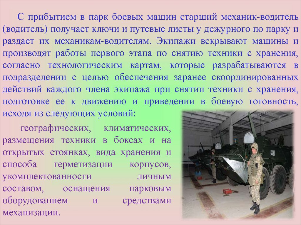С прибытием в парк боевых машин старший механик-водитель(водитель) получает ключи и путевые листы у дежурного по парку и
