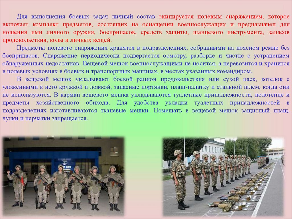Для выполнения боевых задач личный состав экипируется полевым снаряжением, котороевключает комплект предметов, состоящих на оснащении военнослужащих и предназначен для