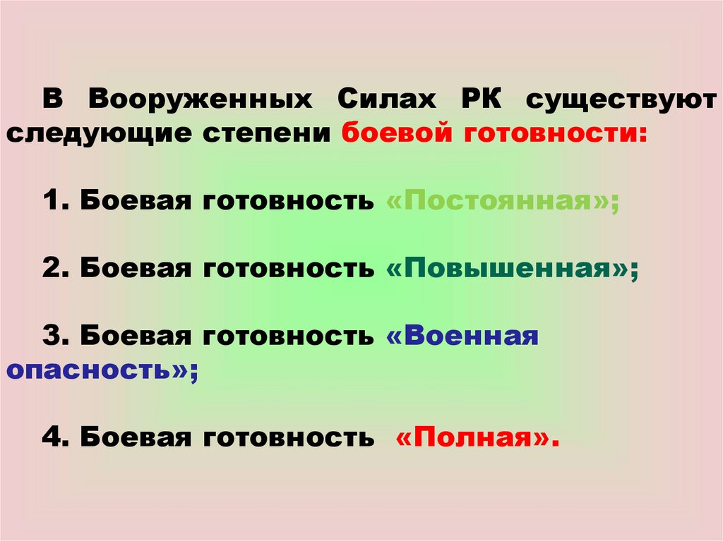 В Вооруженных Силах РК существуютследующие степени боевой готовности: