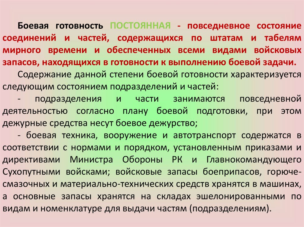 Боевая готовность ПОСТОЯННАЯ - повседневное состояниесоединений и частей, содержащихся по штатам и табелям