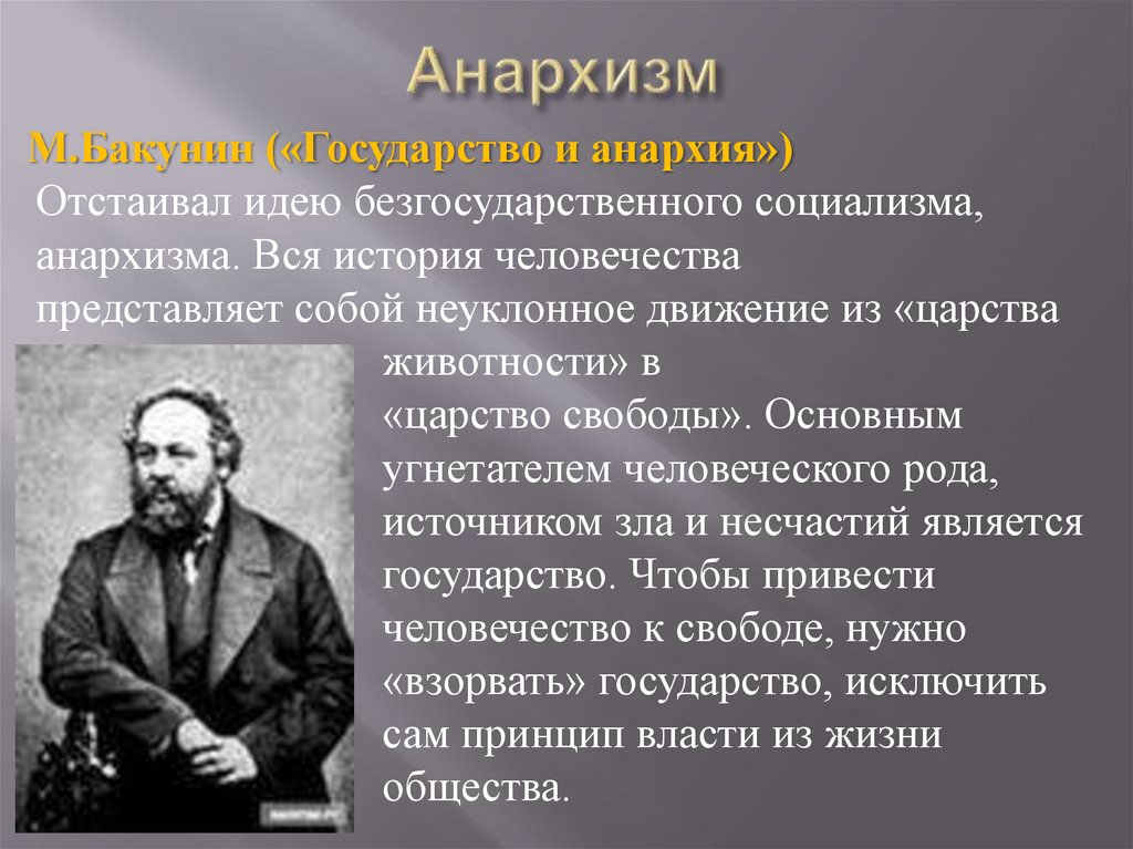 М.Бакунин («Государство и анархия»)Отстаивал идею безгосударственного социализма,