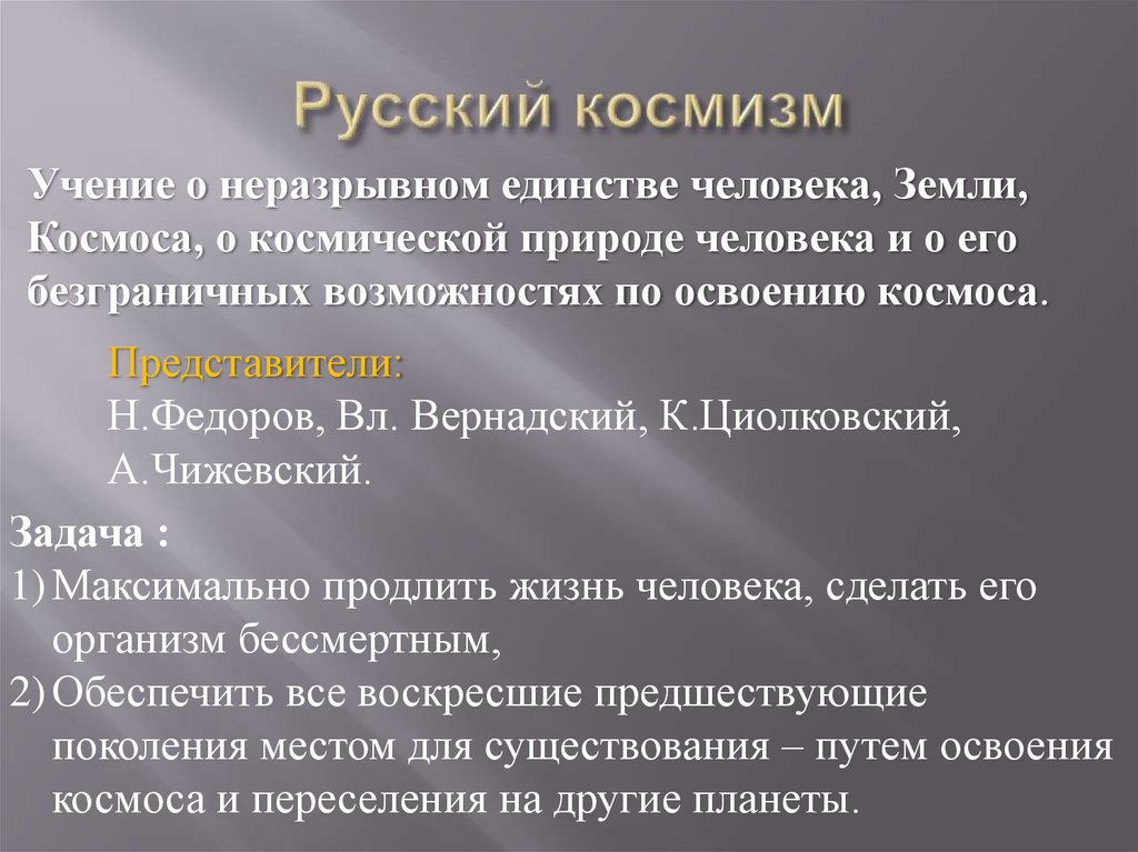 Н.Федоров, Вл. Вернадский, К.Циолковский,