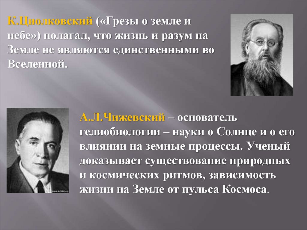 К.Циолковский («Грезы о земле инебе») полагал, что жизнь и разум на
