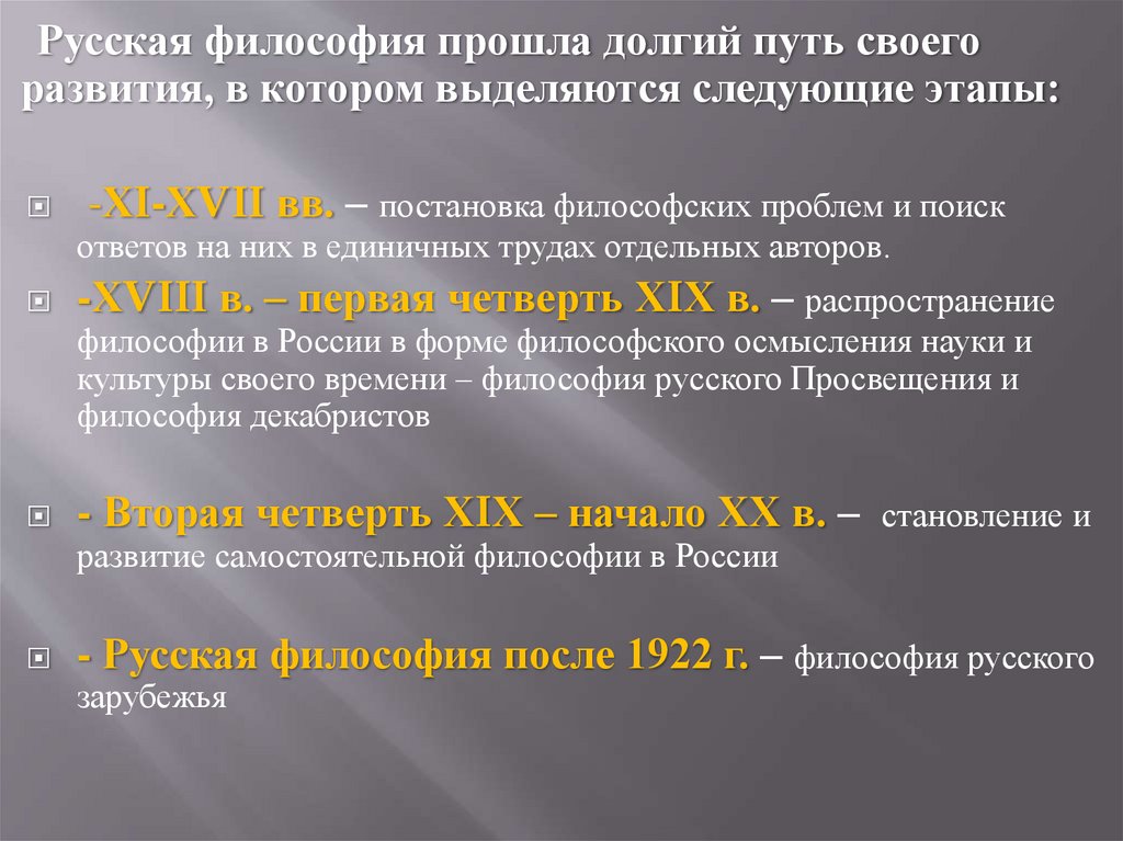 Русская философия прошла долгий путь своегоразвития, в котором выделяются следующие этапы: