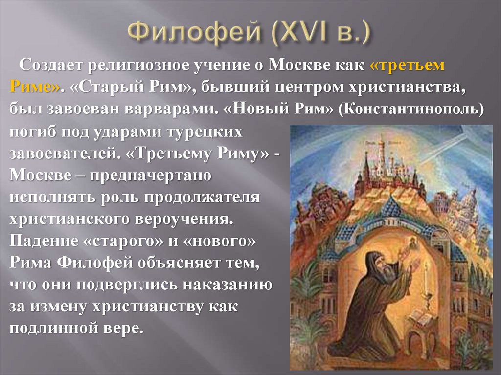 Создает религиозное учение о Москве как «третьемРиме». «Старый Рим», бывший центром христианства,