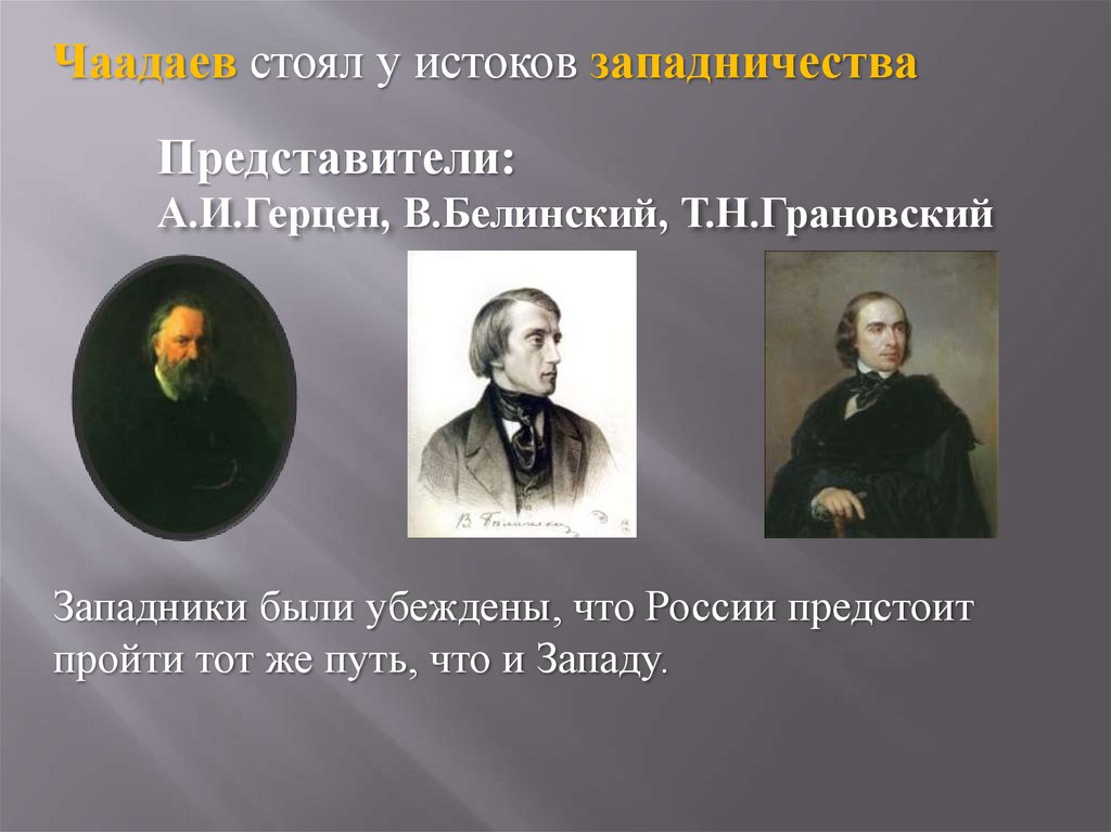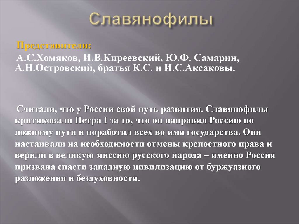 Представители:А.С.Хомяков, И.В.Киреевский, Ю.Ф. Самарин,
