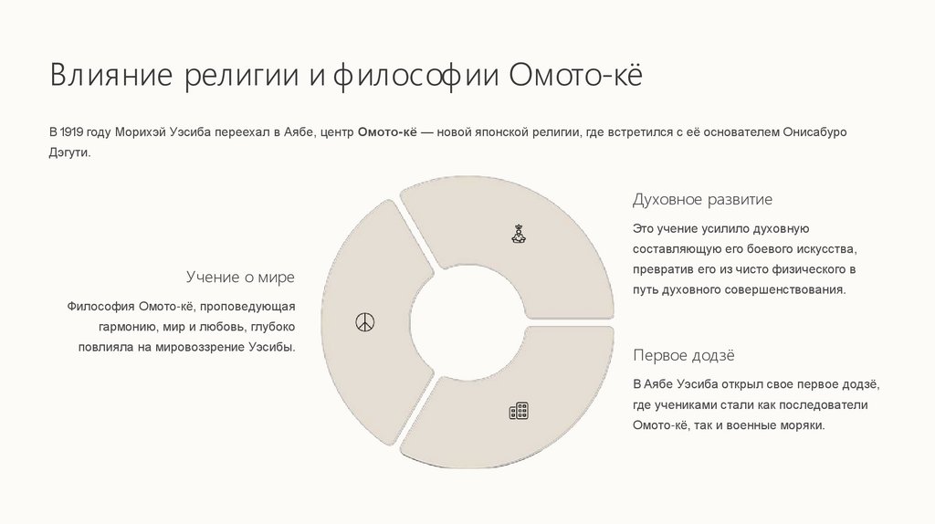 Влияние религии и философии Омото-кёВ 1919 году Морихэй Уэсиба переехал в Аябе, центр Омото-кё — новой японской религии, где встретился с её основателем Онисабуро