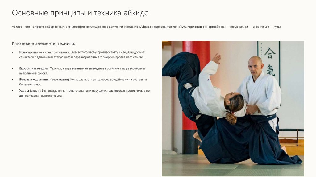 Основные принципы и техника айкидоАйкидо – это не просто набор техник, а философия, воплощенная в движении. Название «Айкидо» переводится как «Путь гармонии с энергией» (ай — гармония, ки — энергия, до — путь).