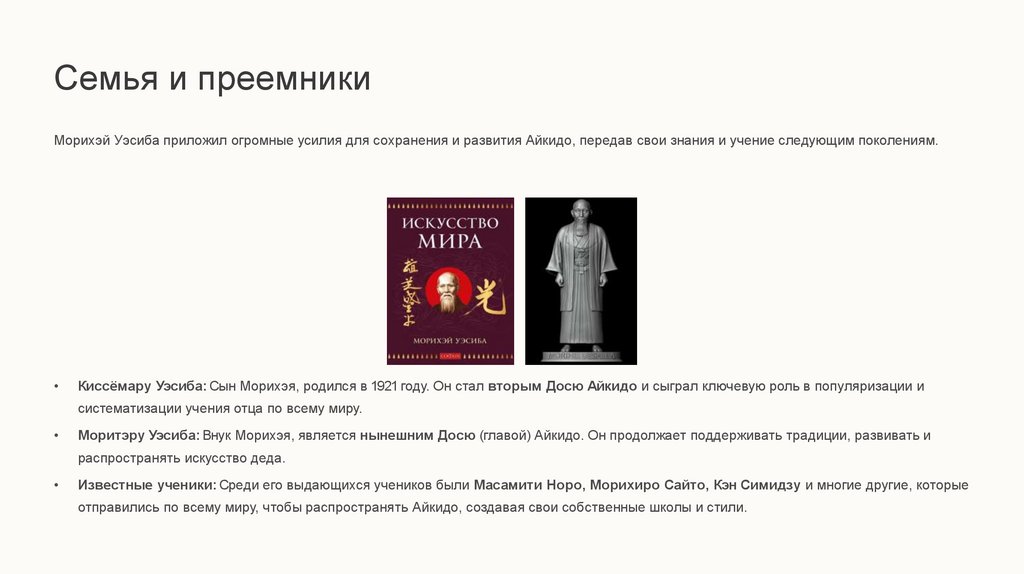 Семья и преемникиМорихэй Уэсиба приложил огромные усилия для сохранения и развития Айкидо, передав свои знания и учение следующим поколениям.